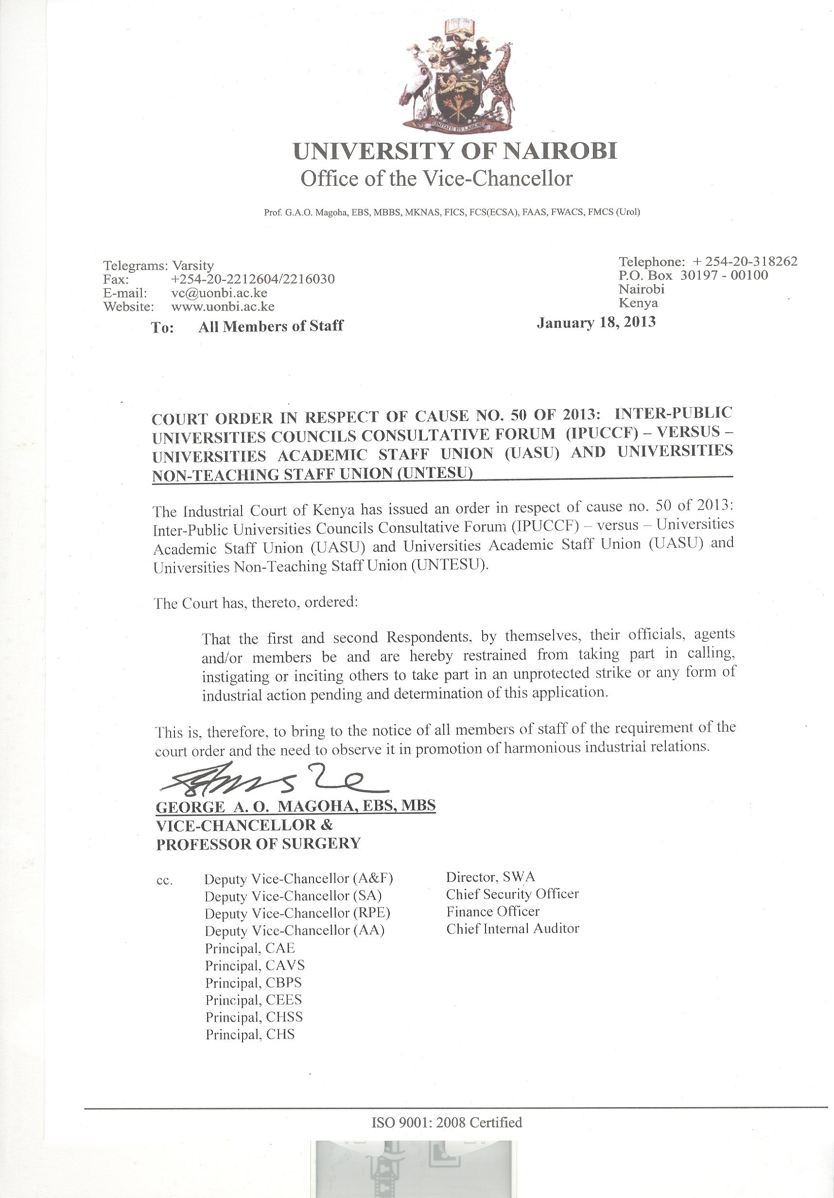 Court order in respect of cause No.50 of 2013: Inter-Public universities councils consultative forum (IPUCCF)-versus-Universities Academic Staff Union (UASU) and Universities Non-Teaching Staff Union(UNTESU)