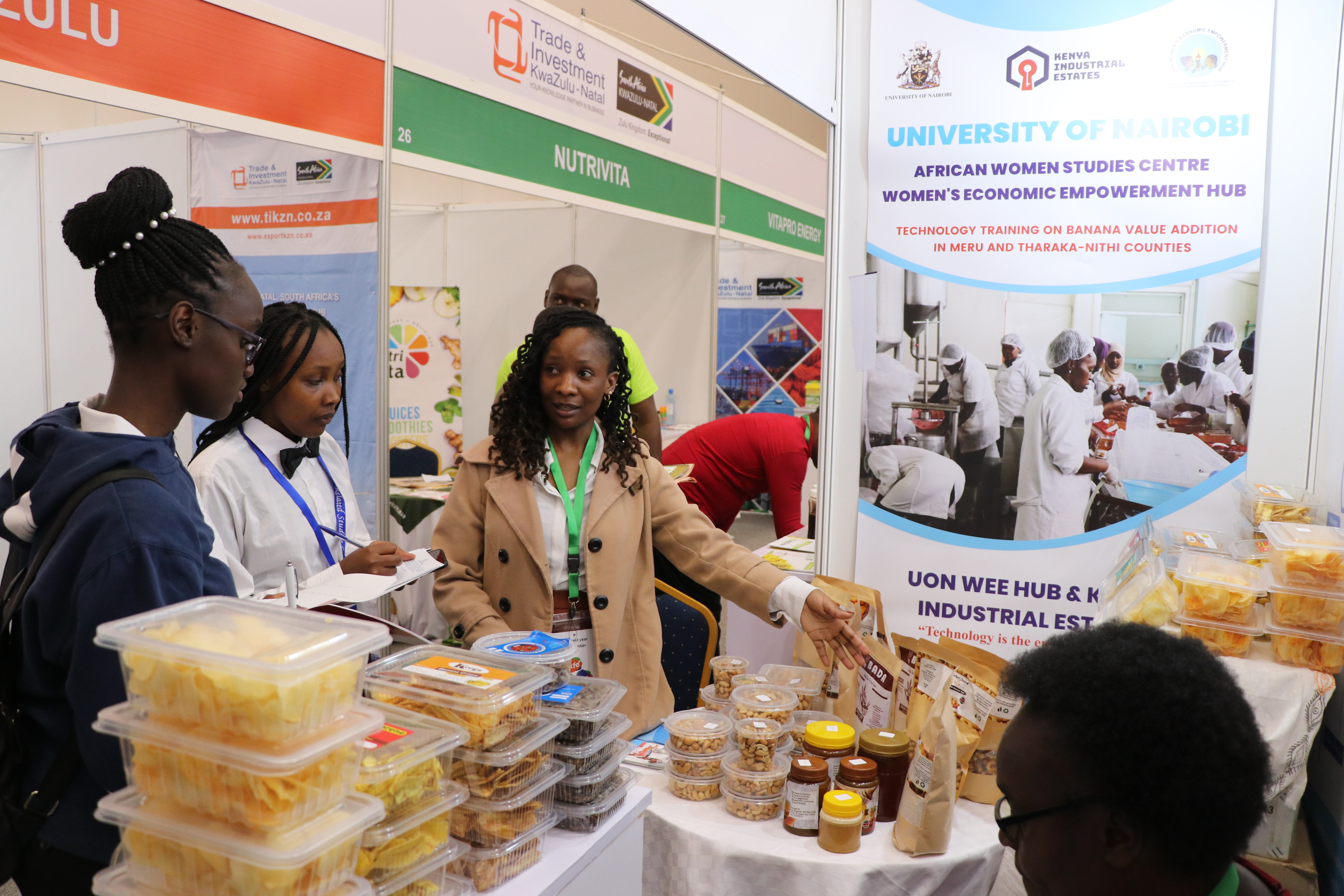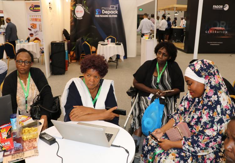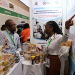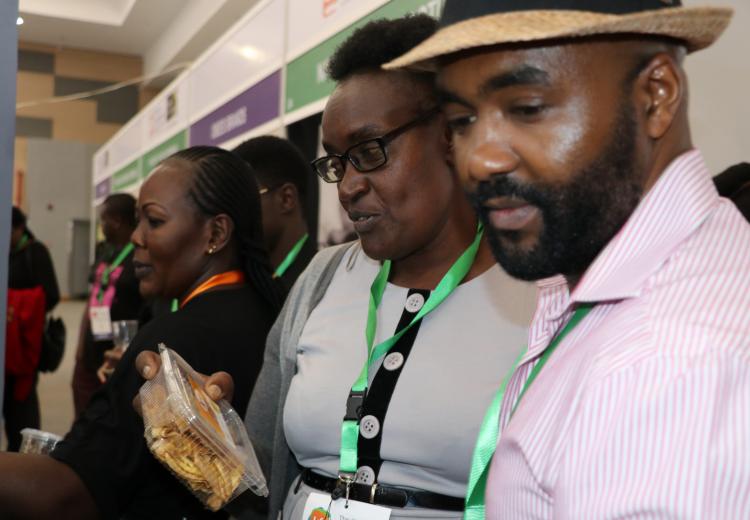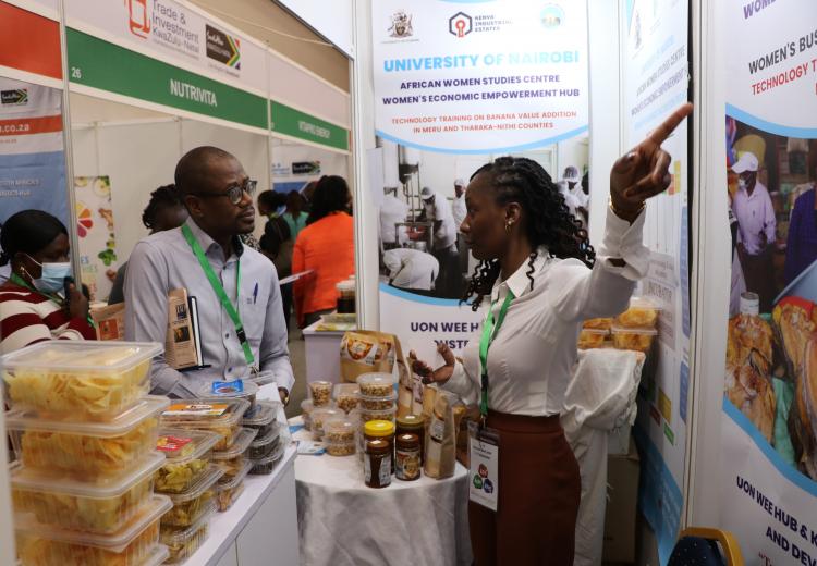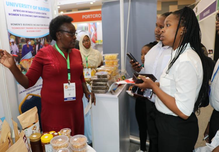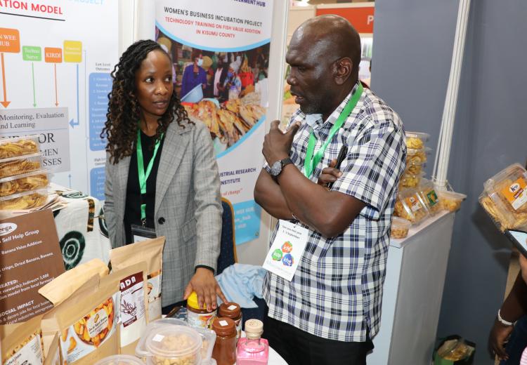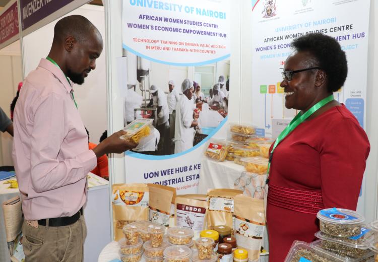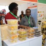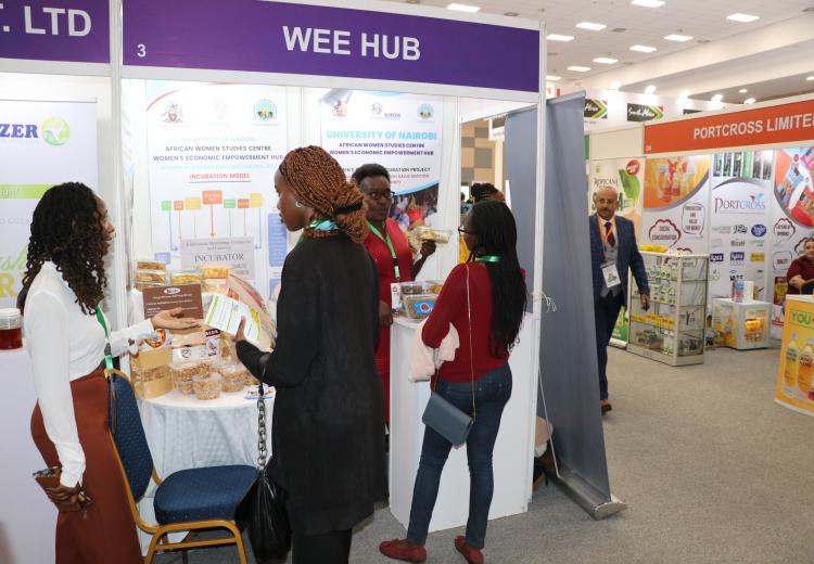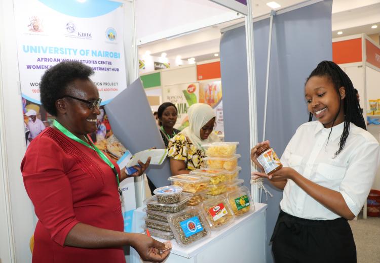 Women entrepreneurs who had undergone technology training on value addition for bananas, cashew nuts, fish, cassava, and honey from Kilifi, Kwale, Kitui, Kisumu, and Meru counties under the Women in Business Project, exhibited at the Kenya Food Event held at the Sarit Centre, Nairobi.