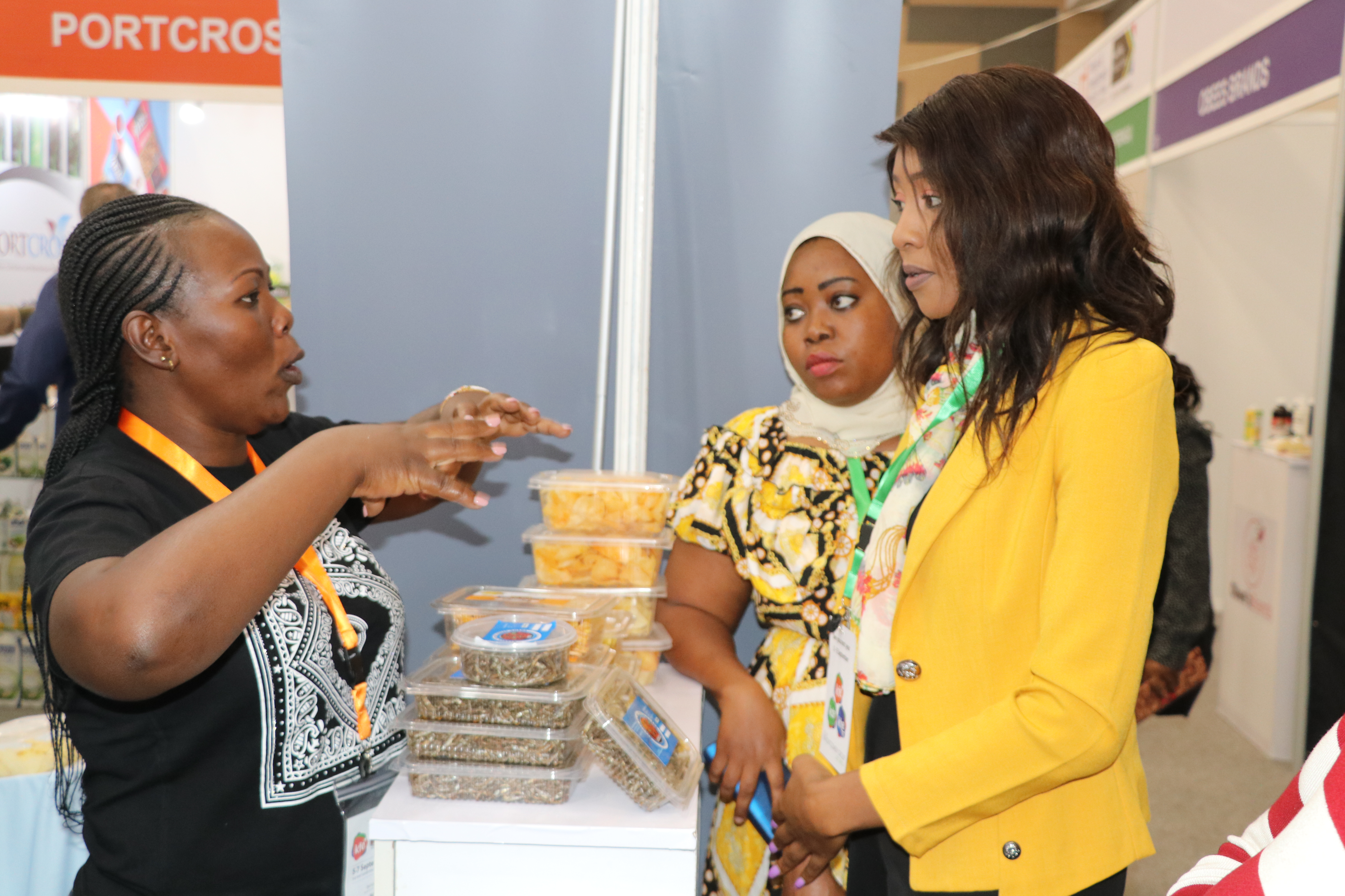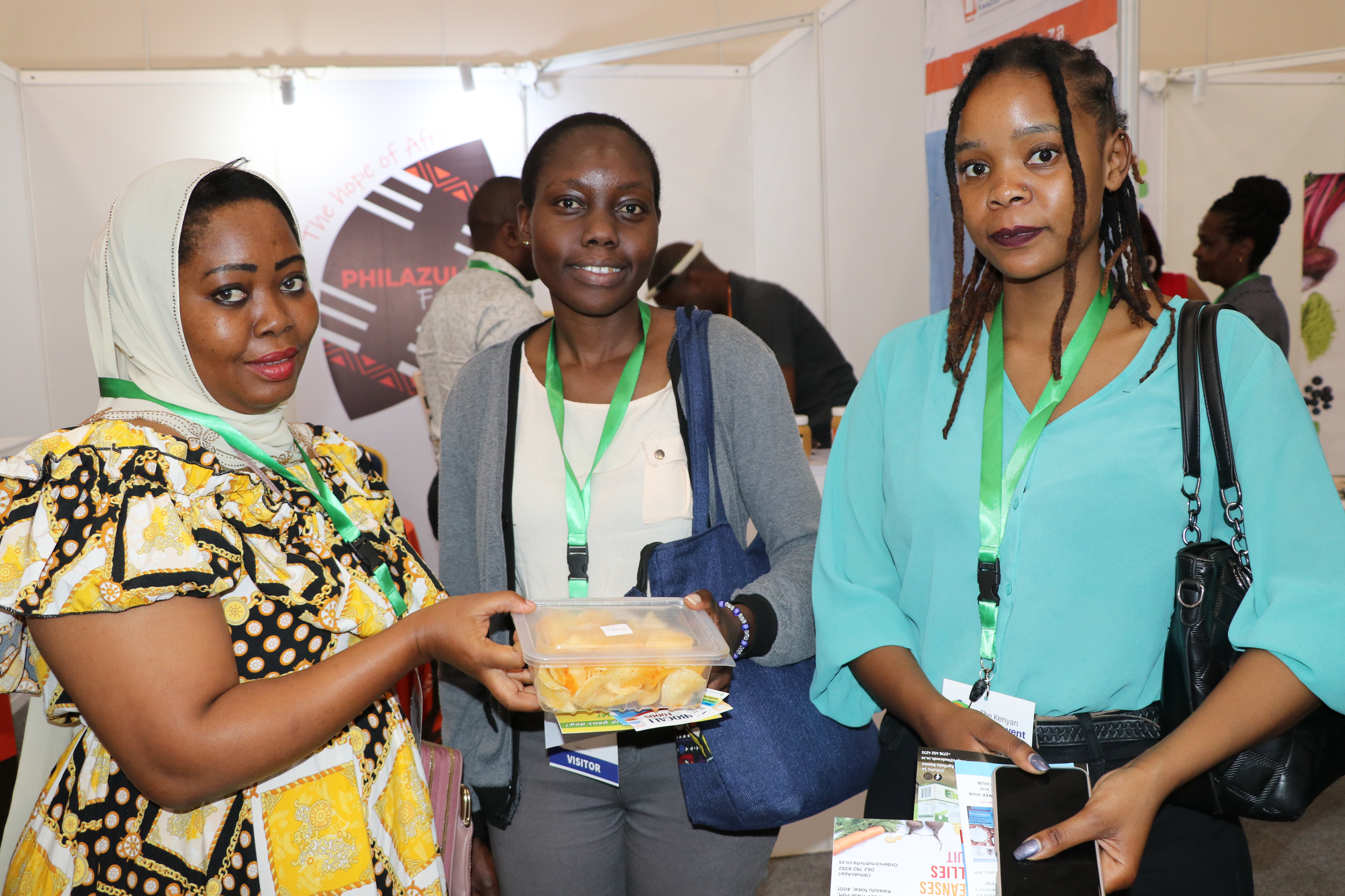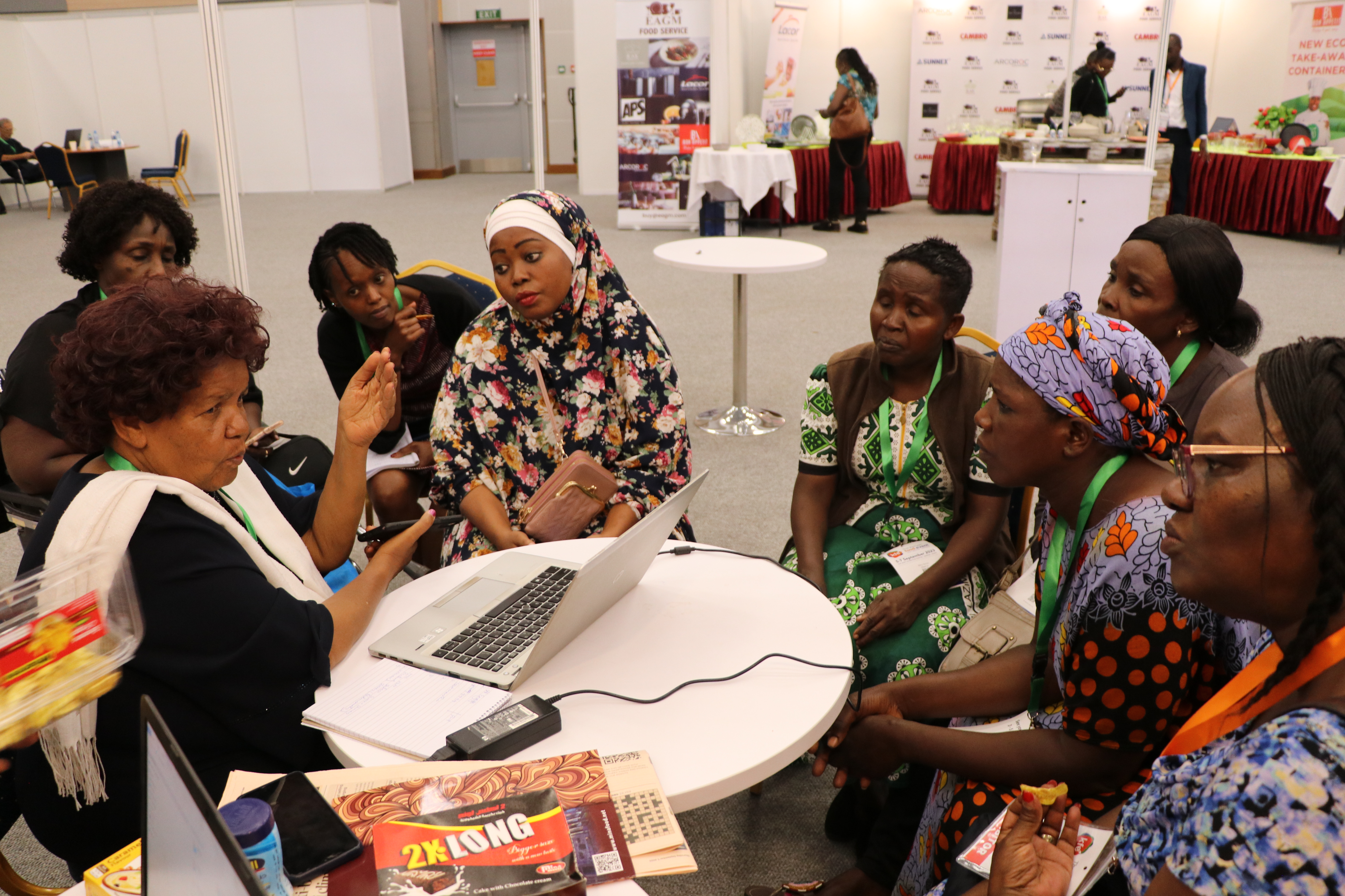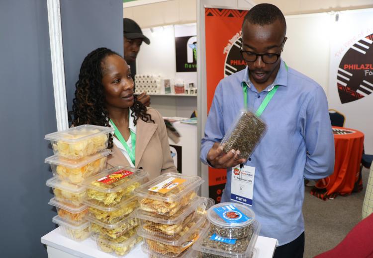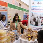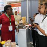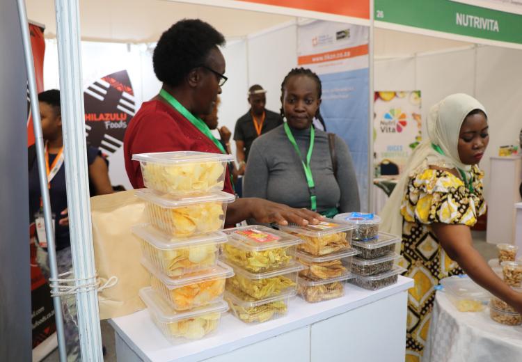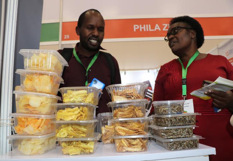 Women entrepreneurs who had undergone technology training on value addition for bananas, cashew nuts, fish, cassava, and honey from Kilifi, Kwale, Kitui, Kisumu, and Meru counties under the Women in Business Project, exhibited at the Kenya Food Event held at the Sarit Centre, Nairobi.